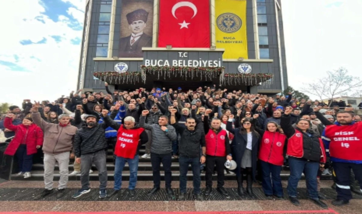 Disk Genel-İş İzmir 6 No'lu Şube Yönetim Kurulu üyeleri ve çalışanlar, Buca Belediyesi önünde toplanarak greve başladı.