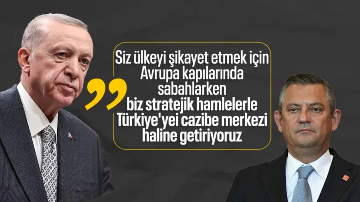 Cumhurbaşkanı Erdoğan, Özgür Özel'e yönelik olarak selefinin geleneğini devam ettirdiğini söyleyerek, "Ülkesini şikayet için Avrupa kapılarında sabahlarken, biz stratejik hamlelerle Türkiye'yi cazibe merkezi haline getiriyoruz" dedi.