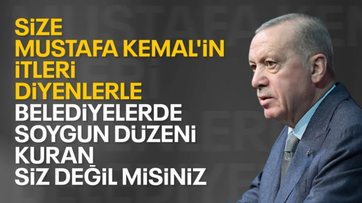 Muhalefete seslenen Cumhurbaşkanı Erdoğan "Gazi Mustafa Kemal'in mirasını yağmalamaktan bıkmadılar. Kendilerine "Mustafa Kemal'in itleri" diyenlerle birlikte belediyelerde soygun düzeni kurmayı "Kent Uzlaşısı" adı altında meşrulaştırma çabasına girdiler" ifadelerini kullandı.