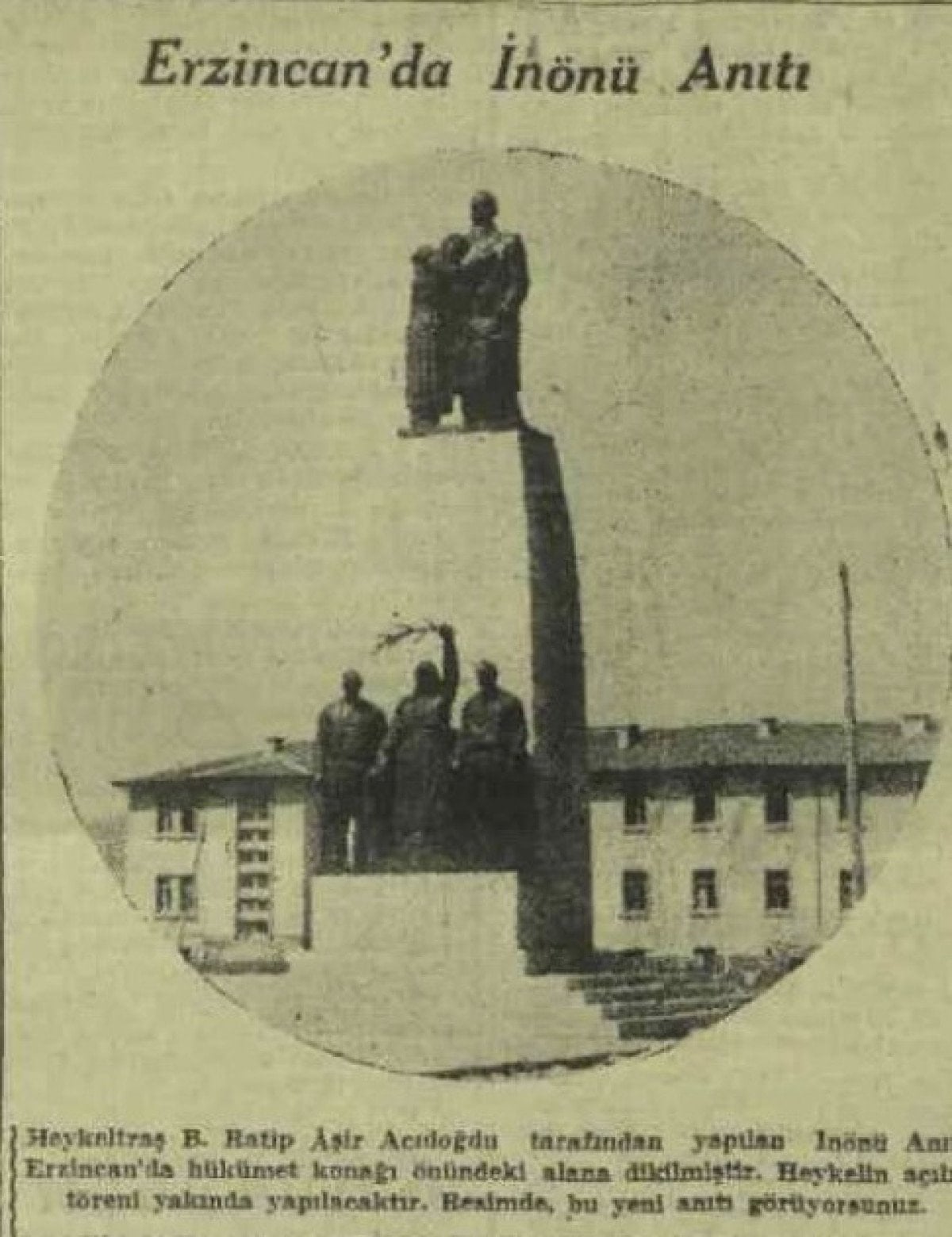 “Güzel Sanatlar Akademisi müdürlüğünden vilâyetimize gelen bir yazıdan yeni Erzincan şehrinde yapılacak tarihî İnönü abidesinin müsabakaya çıkarıldığı anlaşılmıştır. Abide millî mahiyette olduğundan yalnız Türkiye Cumhuriyeti tabiiyeti ve Türkiye'de heykeltıraşlık salâhiyetini haiz kimseler müsabakaya iştirak edebileceklerdir. Teklifler 7/1/1943 gününe kadar kabul olunacak, birincisine 1.500, ikincisine 500, üçüncüsüne 300 lira mükâfat verilecektir. Bu haber bütün Erzincanlılar arasında sevinç uyandırmıştır.” (Akşam, 19 Eylül 1942)