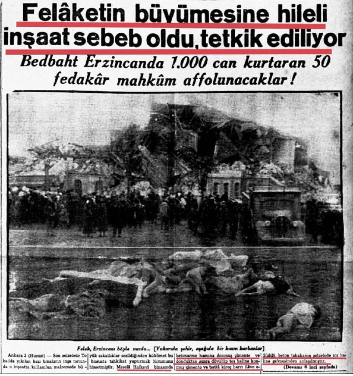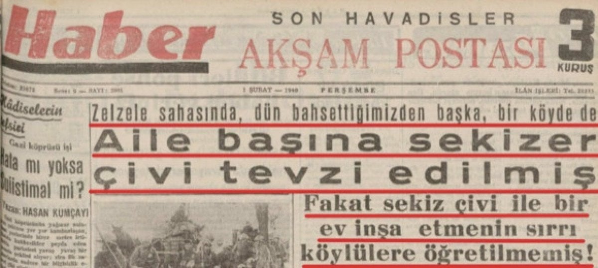 Cumhurbaşkanı Recep Tayyip Erdoğan, 11 ilde inşası biten yarım milyona yakın deprem konutuna ciğere ulaşamayan kedi misali burun kıvıran CHP’yi yine topa tuttu ve “1939 Erzincan depremi olduğunda dönemin iktidarı vatandaşa yardım namına sadece 8 çivi tevzi etmiş, fakat bu 8 çivi ile ev inşa etmenin sırrını milletimize öğretmemişti” diye noktayı koydu. Gerçekten de 1 Şubat 1940 tarihli Haber gazetesinin manşeti şöyleydi: